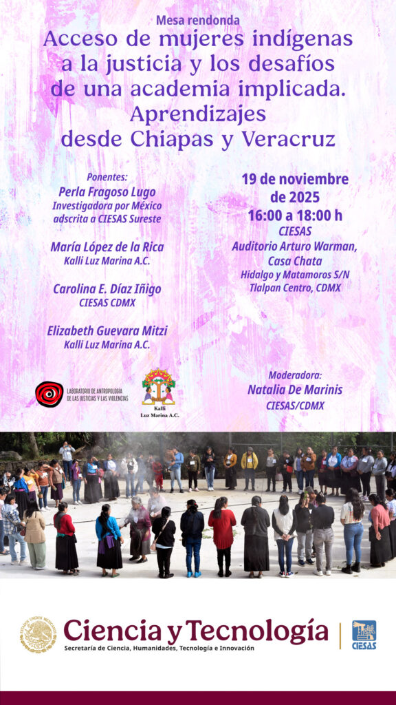 Este conversatorio busca abrir un espacio de diálogo en torno a las sinergias de saberes que se tejen en los procesos de acceso a la justicia de mujeres indígenas en Chiapas y Veracruz. Nos proponemos poner en relación las experiencias de las organizaciones de mujeres, sus conocimientos, prácticas y desafíos en la búsqueda de justicia, junto con el papel del saber académico en los procesos de incidencia legal y acompañamiento.